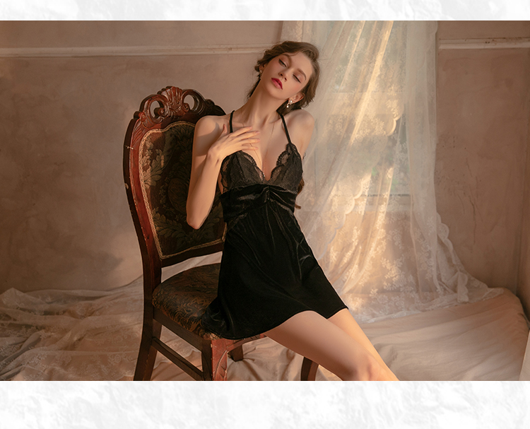 性感睡衣金丝绒秋冬季2021年新款私房小胸诱惑蕾丝纯欲风吊带睡裙