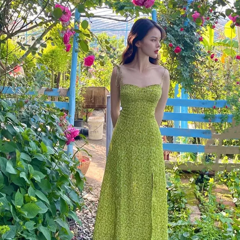 法式小众新款度假风牛油果绿色碎花吊带连衣裙夏气质收腰显瘦开叉