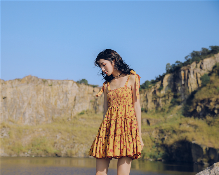超仙三亚沙滩裙女小个子吊带连衣裙海边度假短裙黄色小清新碎花裙