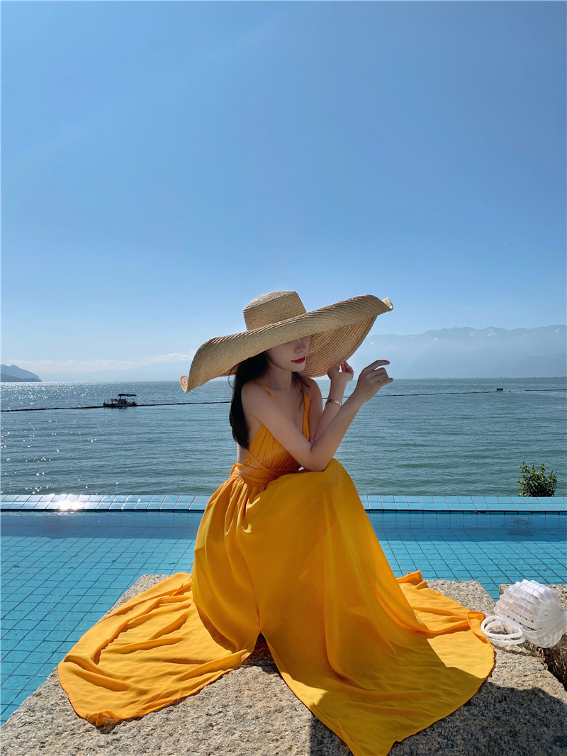 三亚旅游拍照衣服女性感交叉露背吊带连衣裙黄色海边度假沙滩长裙