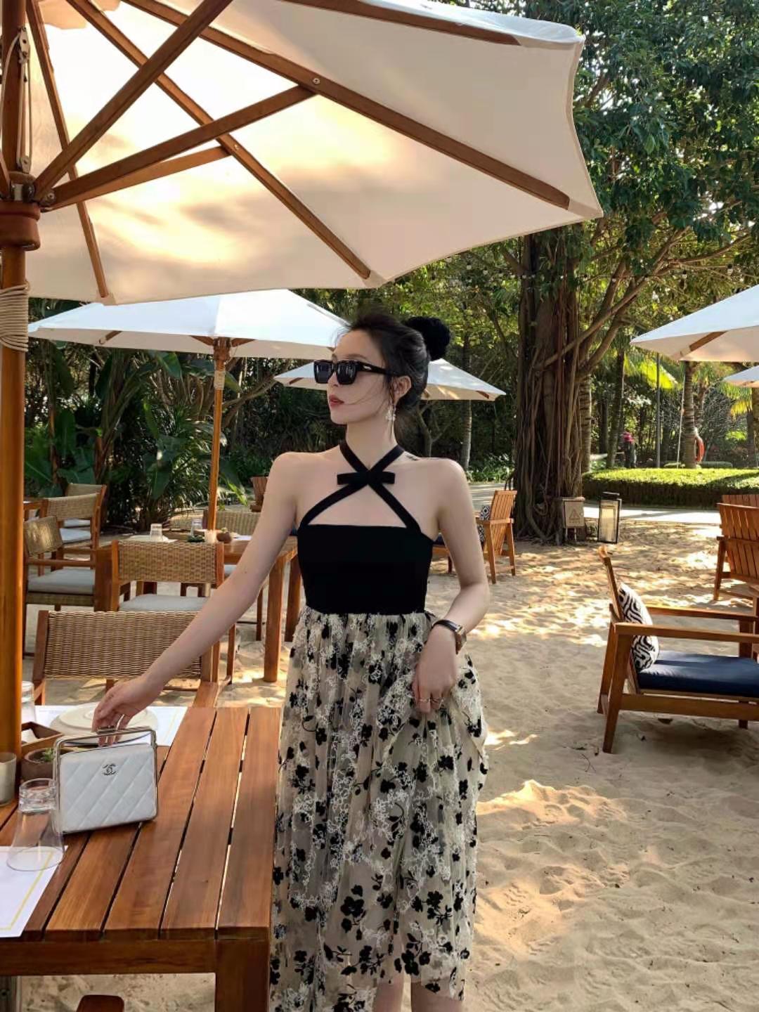 法式复古冷淡风设计感挂脖度假裙重工刺绣网纱吊带裙三亚海边度假