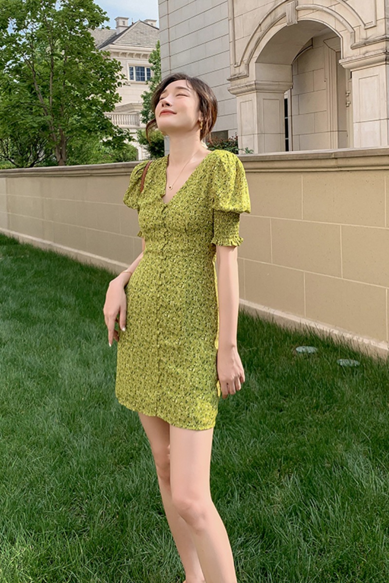 法式碎花连衣裙女2020夏季牛油果绿色V领修身赫本风泡泡袖茶歇裙