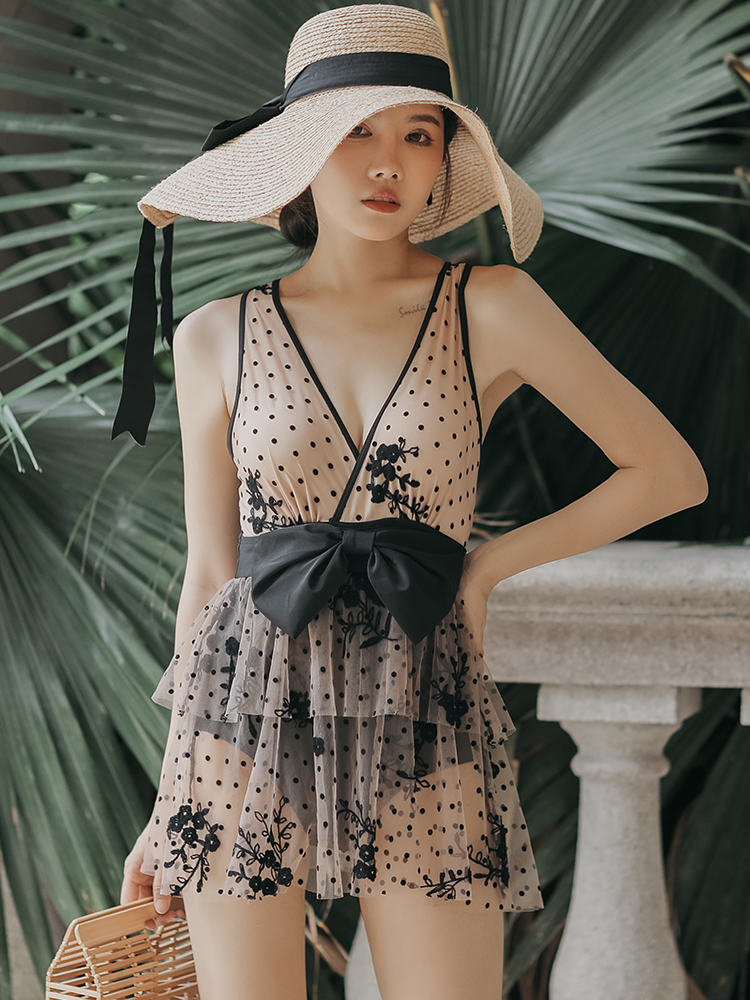 性感蕾丝波点遮肚显瘦温泉度假连体泳衣女