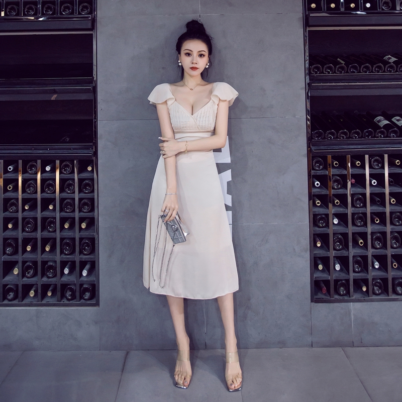 新款轻熟风V领短高腰修身显瘦气质中长款连衣裙女