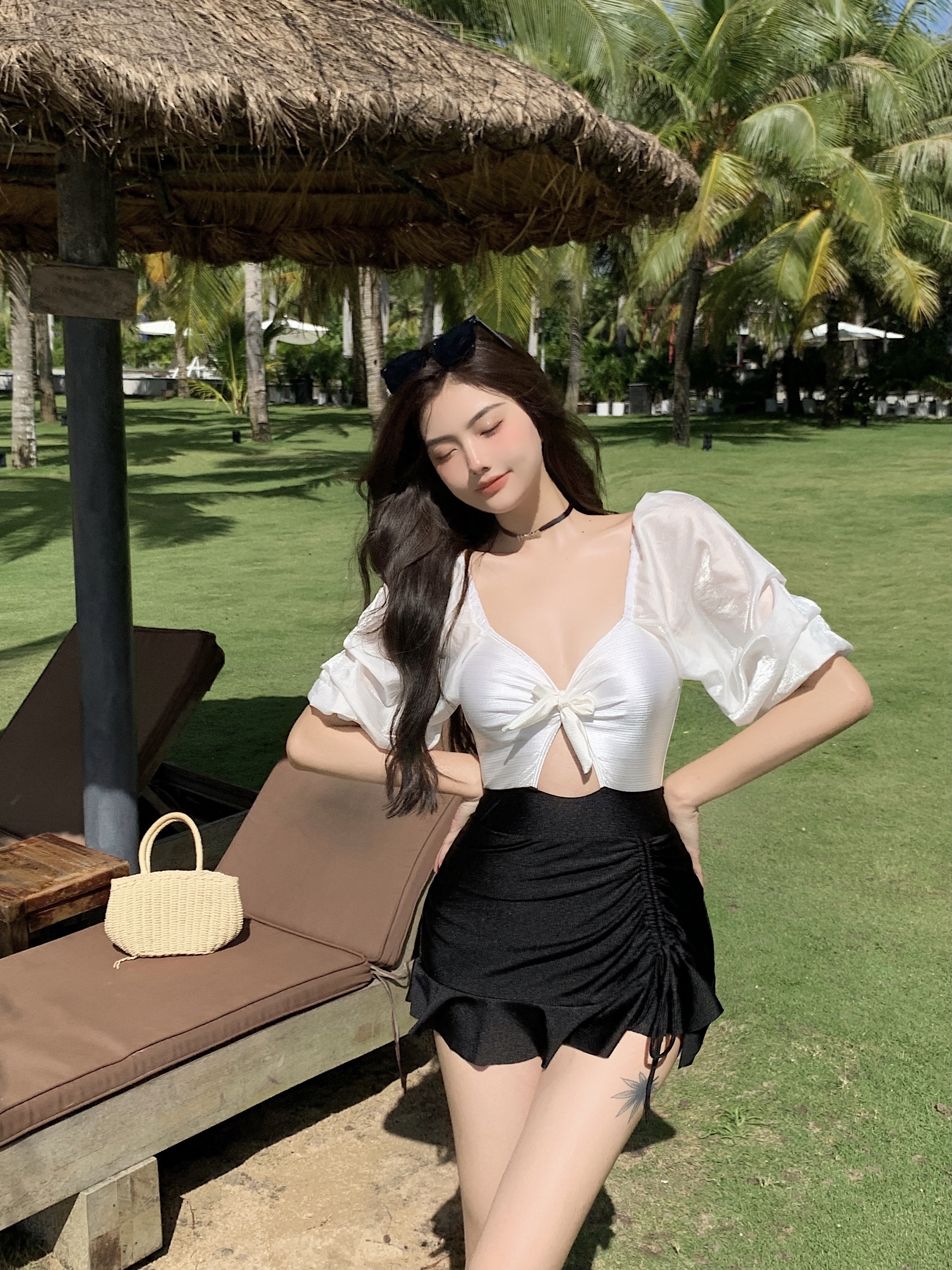 小胸聚拢仙女范保守性感露背绑带纯欲温泉游泳装