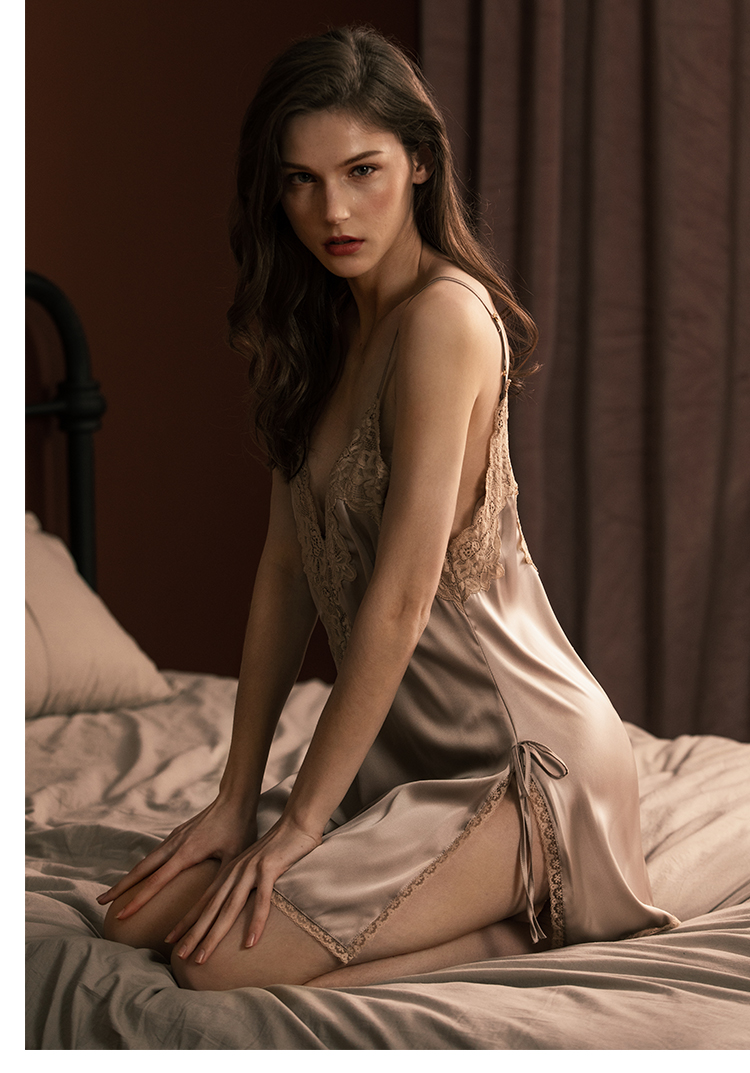 被迫卖睡衣 花边深V睡裙真丝薄款露背吊带开叉家居服性感睡衣女秋