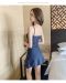 韩版新款水墨青花瓷三角连衣泳衣挂脖花纹女泳衣